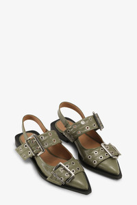 These Green Feminine Buckle Ballerinas feature slingback straps and a pointed toe. The shoes have two silver-tone buckles with matching eyelets and a black squared block heel. DETAILS - 51% recycled polyester, 49% polyester. Learn more about our materials - Lining composition: 76% Polyurethane 24% Viscose - Slingback straps - Pointed toe - Two silver-tone buckles with eyelets - Black squared block heels Made in: Portugal Product ID: S2648 SIZE & FIT - Fits true to size, take your normal size - Glossy