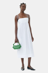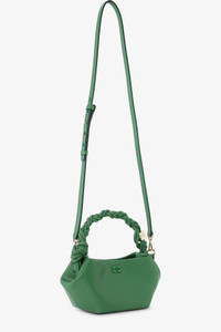 This Green Mini GANNI Bou Bag features a tone-on-tone metallic GANNI Butterfly logo, a twisted handle with a braided knot, and a gold-tone metallic dice with a GANNI Butterfly logo engraved. The bag has an internal magnetic closure, a flat card pocket inside, and an adjustable and removable shoulder strap for crossbody wear. DETAILS - 65% recycled leather, 19% polyurethane fibre, 16% polyester. Learn more about our materials - Lining composition: 65% Recycled Cotton 35% Cotton - Adjustable and removable shoulder strap - Tone-on-tone GANNI Butterfly logo - GANNI embossed logo on the back of the bag - Braided top handle with a braided knot - Metallic dice with a GANNI and Butterfly logo engraved - Internal magnet closure - One compartment - Flat card pocket inside Made in: China Product ID: A5651 SIZE & FIT - Strap length: 50 - Height: 11 - Width: 25 - Depth: 11.5