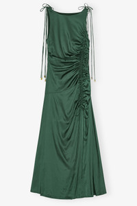 This dress features a round neckline, adjustable shoulder ties, ruching along the bodice and a high slit with GANNI Butterfly logo tie-strings finish. DETAILS - 96% viscose, 4% elastane. Learn more about our materials - Lining composition: 97% Polyester 3% Elastane - Round neckline - Adjustable shoulder ties - Ruching along the bodice - High slit at the front - Tie detail - GANNI Butterfly logo Made in: China Product ID: W0739 SIZE & FIT - Long length - Slim fit - Bernie is 5’10” and wears a size US 4 - For personalised guidance on sizing and fit, contact our Customer Service team - here - .