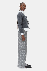 These Grey Jacquard Cargo Pants feature large front patch pockets and side cargo pockets. The pants have a hook and bar closure, a single pocket with a flap at the back and snap button details at the bottom of the legs, allowing for adjustable fit and style. DETAILS - 63% acetate, 37% polyester . Learn more about our materials - Lining composition: 100% Recycled Polyester - Hook and bar closure - Pockets at the front, side and back Made in: China Product ID: W0168 SIZE & FIT - Relaxed fit - Tonia is 5’9” and wears a size US 4