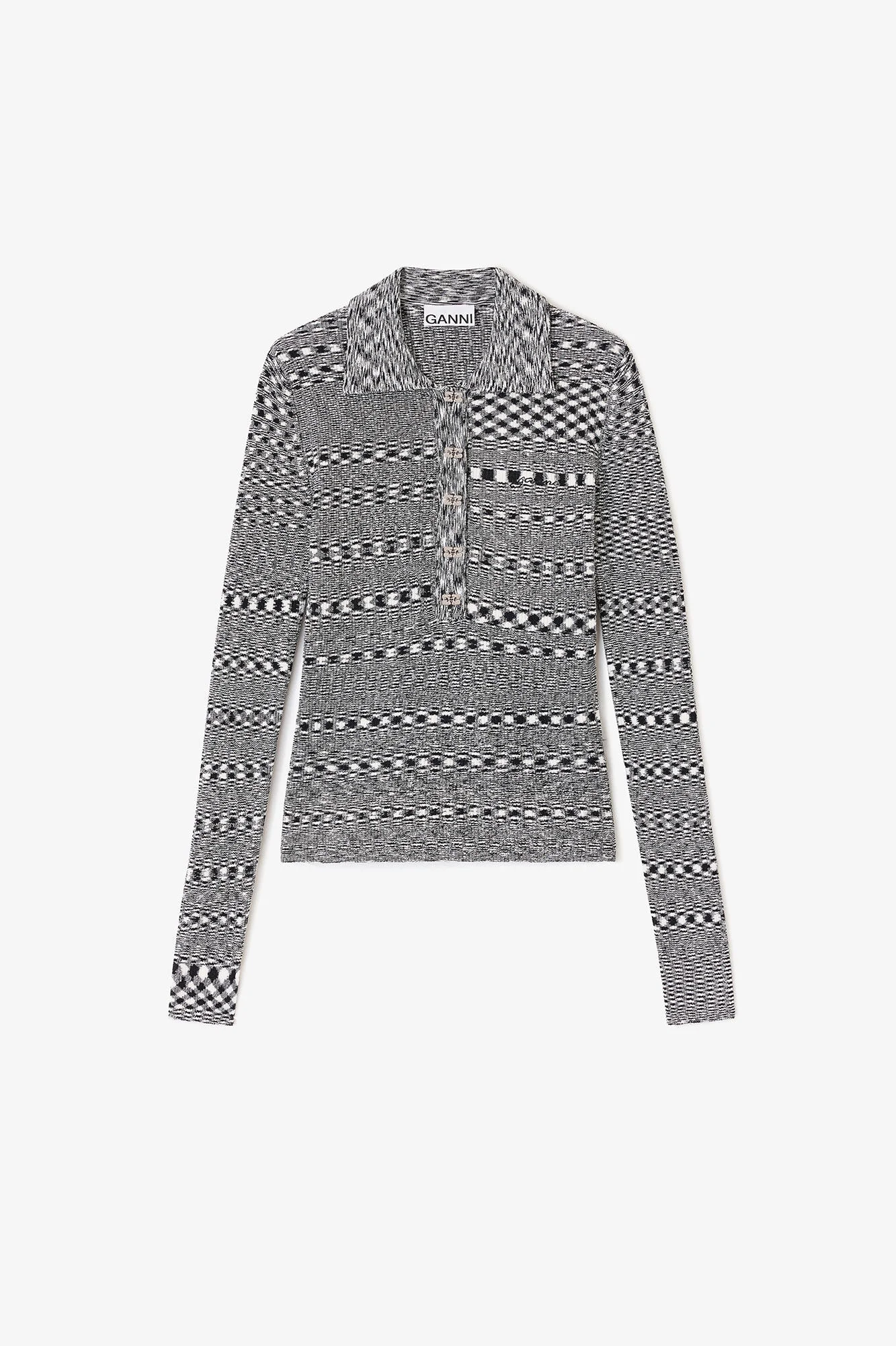 This polo shirt features a collar, long sleeves and a button placket with GANNI Butterfly buttons. DETAILS - 85% viscose, 15% polyamide. Learn more about our materials - Classic collar - Button placket - Long sleeves - Embroidered GANNI logo - Silver-tone GANNI Butterfly logo buttons Made in: China Product ID: K2606 SIZE & FIT - Regular fit - Lena is 5’9” and wears a size S - For personalised guidance on sizing and fit, contact our Customer Service team - here - .