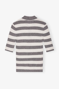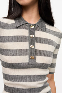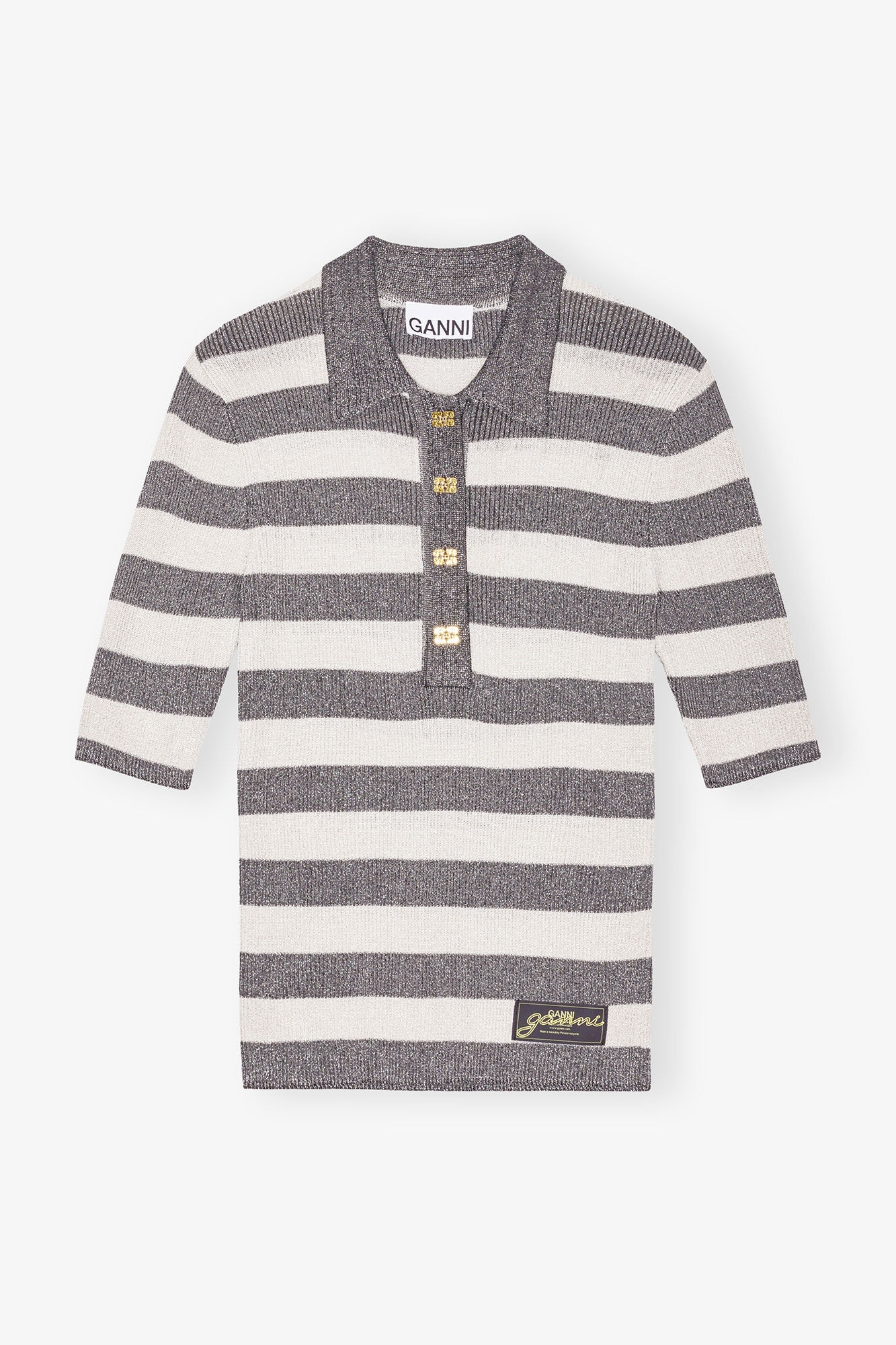 This Grey Striped Sparkle Rib Polo T-Shirt features a collar, button closure at the front, short sleeves and a sewn-on GANNI logo patch. DETAILS - 50% viscose, 22% recycled nylon, 17% recycled polyester, 11% metallic polyester . Learn more about our materials - Collar - Short sleeves - Button closure at the front - Sewn-on GANNI logo patch Made in: China Product ID: K2482 SIZE & FIT - Cara is 5’9” and wears a size S
