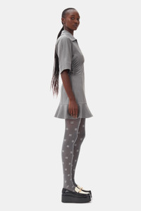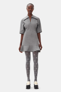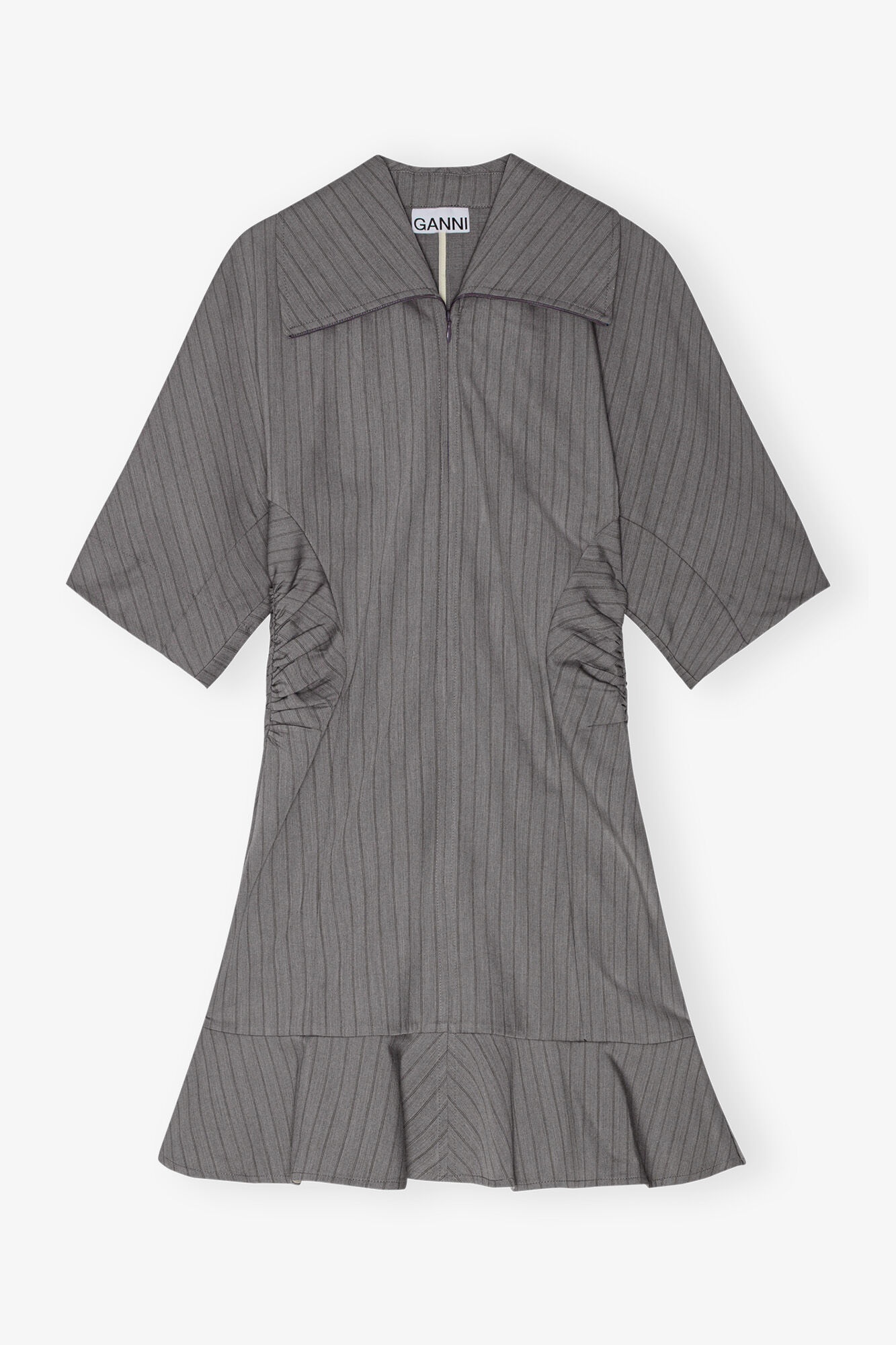 This Grey Striped Suiting Mini Dress features a mid-length sleeves with a slightly flared design and a large collar with a zipper closure at the front. The dress is slightly fitted at the waist with ruched detailing on the sides and a peplum hem. DETAILS - 48% LENZING™ ECOVERO™ viscose, 44% recycled polyester, 5% elastane, 3% polyester. Learn more about our materials - Lining composition: 100% Cotton - Large collar - Mid-length sleeves - Zip closure - Peplum hem - Ruched detailing on the sides Made in: Turkey Product ID: F9479 SIZE & FIT - Designed for a slim fit - Tonia is 5’9” and wears a size US 4