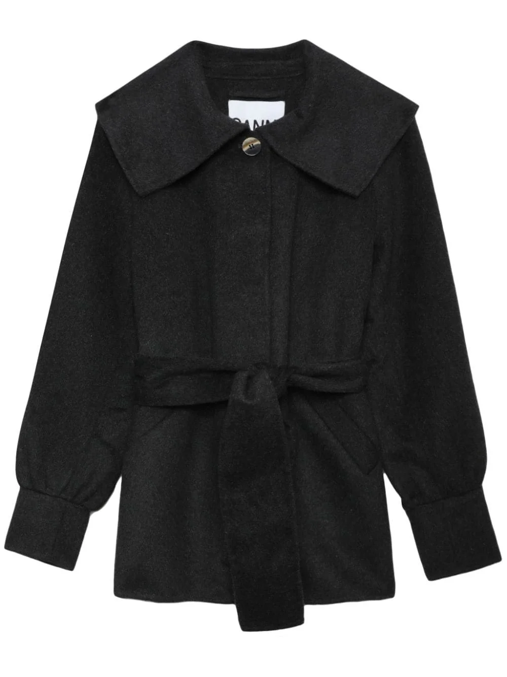 belted-waist wool-blend jacket Highlights - Black - Wool blend - Spread collar - Belted waist - Fitted-cuff sleeves - Concealed front fastening - Two side slash pockets - Straight hem Imported Composition Recycled Wool 50%, Recycled Polyester 40%, Viscose 5%, Polyamide 5% Washing instructions Read Manufacturer Guidelines