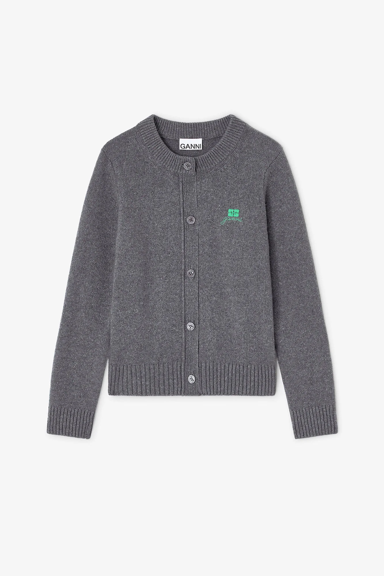 This cardigan features a round neck, button-front closure and an embroidered GANNI logo DETAILS - 60% wool, 20% viscose, 20% viscose (made with CIRCULOSE®). Learn more about our materials - Round neck - Button-front closure - Ribbed edges - GANNI logo This style contains viscose made with CIRCULOSE®. CIRCULOSE® recovers cellulose fibres from worn-out cotton jeans and cotton production scraps, through a chemical recycling process, transforming them into new high-quality fibres. CIRCULOSE® is part of GANNI’s Fabrics of the Future, a programme set up in 2019 by GANNI to research, test and eventually scale innovative materials that challenge conventional material methods, paving the way for the future of fashion. Made in: Moldova Product ID: K2592 SIZE & FIT - Regular fit - Ayesha is 5’9” and wears a size S - For personalised guidance on sizing and fit, contact our Customer Service team - here - .
