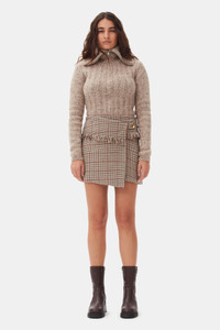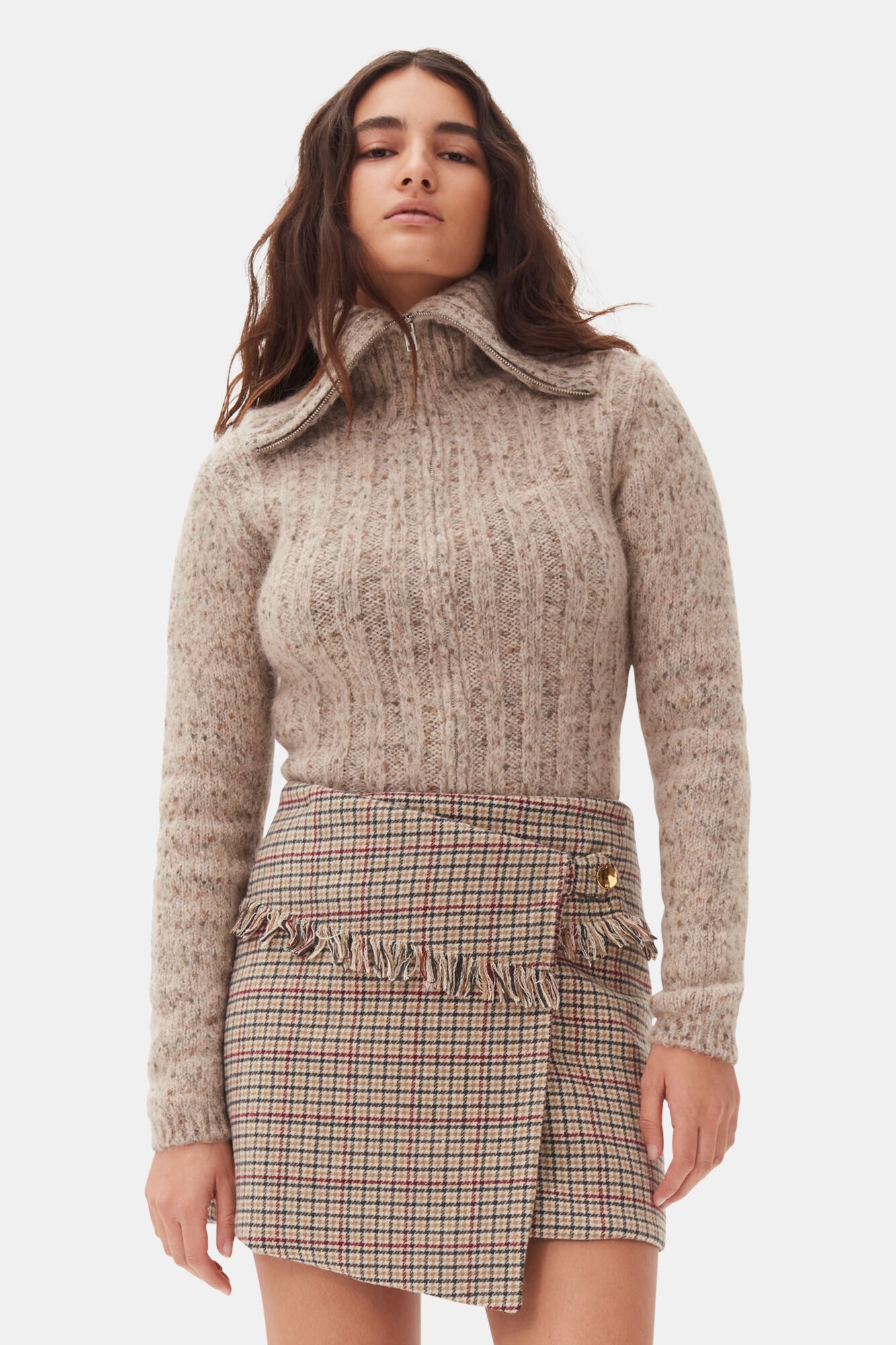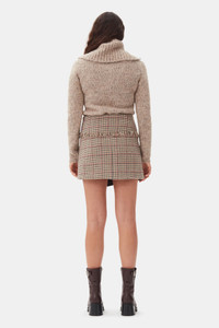 This Brown Highneck Zip Cardigan features a full front zipper closure with a silver zipper, a high collar that can be worn up or folded down and an embroidered GANNI logo. DETAILS - 35% alpaca, 29% organic cotton, 26% recycled polyamide, 8% polyamide, 2% elastane. Learn more about our materials - High collar - Zip closure - Embroidered GANNI logo Made in: Moldova Product ID: K2277 SIZE & FIT - Slim fit - Marimar is 5’9” and wears a size S