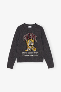 This Dark Grey Graphic Tiger Sweater features a round neckline, long sleeves, ribbed edges and a graphic GANNI motif. DETAILS - 43% wool, 37% recycled wool, 19% recycled polyamide, 1% polyamide. Learn more about our materials - Round neckline - Long sleeves - Ribbed edges Made in: Romania Product ID: K2278 SIZE & FIT - Regular fit - Vigga is 5’9” and wears a size S
