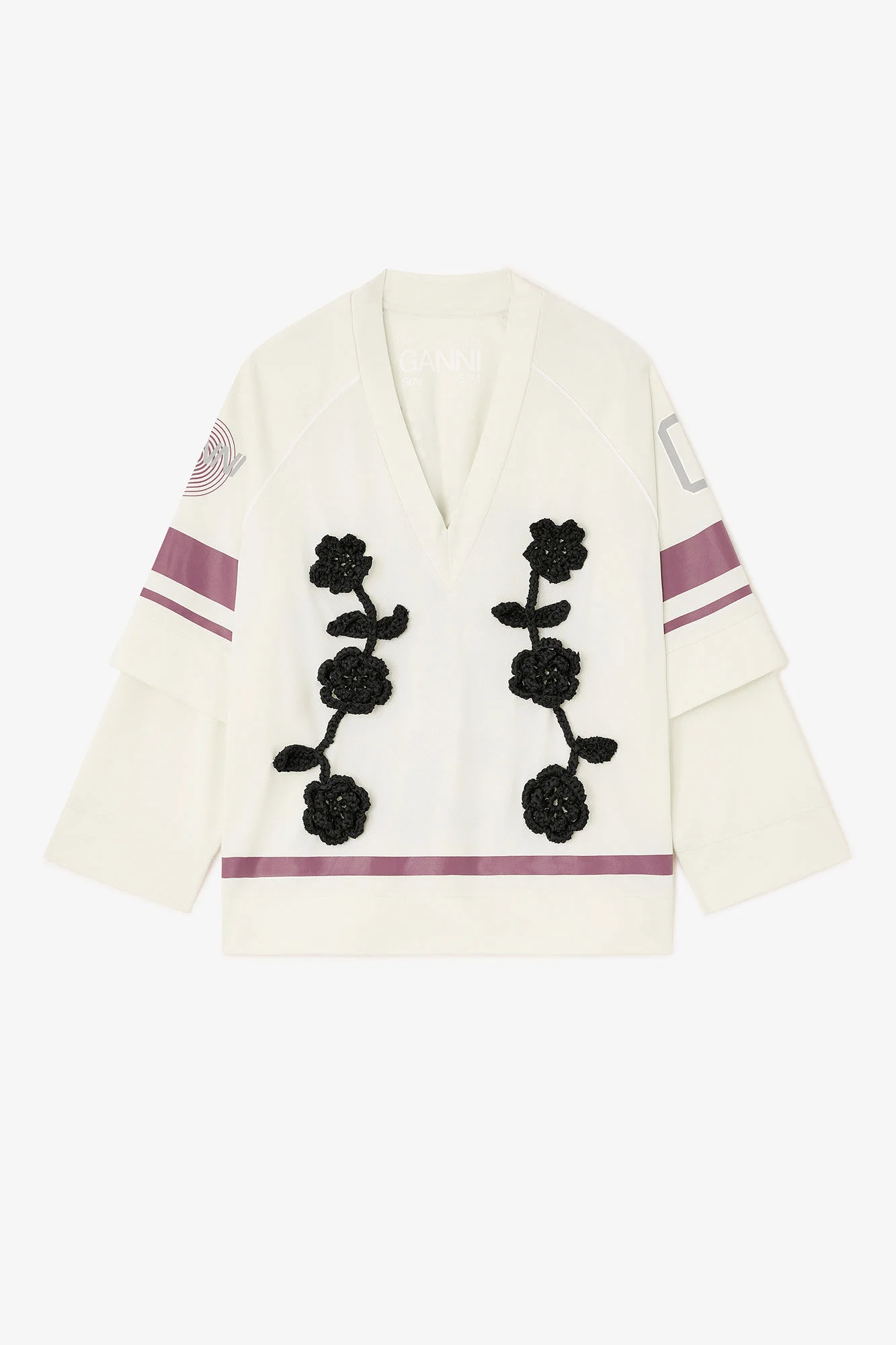This top features a V-neckline, long sleeves and flower crochet detailing. DETAILS - 70% polyester, 30% recycled polyester (Cycora®) . Learn more about our materials - V-neckline - Long sleeves - Flower crochet detailing This style contains cycora®. cycora® is turning the textiles of the past into the clothing of the future. Made entirely from textile waste, using advanced molecular regeneration technology, textiles are broken down to the molecular level and transformed into cycora® yarns. cycora® is part of GANNI’s Fabrics of the Future, a programme set up in 2019 by GANNI to research, test and eventually scale innovative materials that challenge conventional material methods, paving the way for the future of fashion. Made in: China Product ID: T4404 SIZE & FIT - Oversized fit - Yaniris is 5’11” and wears a size S/M - For personalised guidance on sizing and fit, contact our Customer Service team - here - .