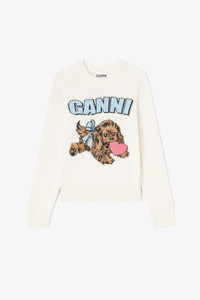This sweater features a round neckline, long sleeves, ribbed edges, a puppy print graphic and a GANNI logo. DETAILS - 45% wool, 35% recycled wool, 20% recycled polyamide. Learn more about our materials - Round neckline - Long sleeves - Ribbed edges - Puppy graphic print - GANNI logo Made in: Romania Product ID: K2562 SIZE & FIT - Regular fit - Lena is 5’9” and wears a size S - For personalised guidance on sizing and fit, contact our Customer Service team - here - .