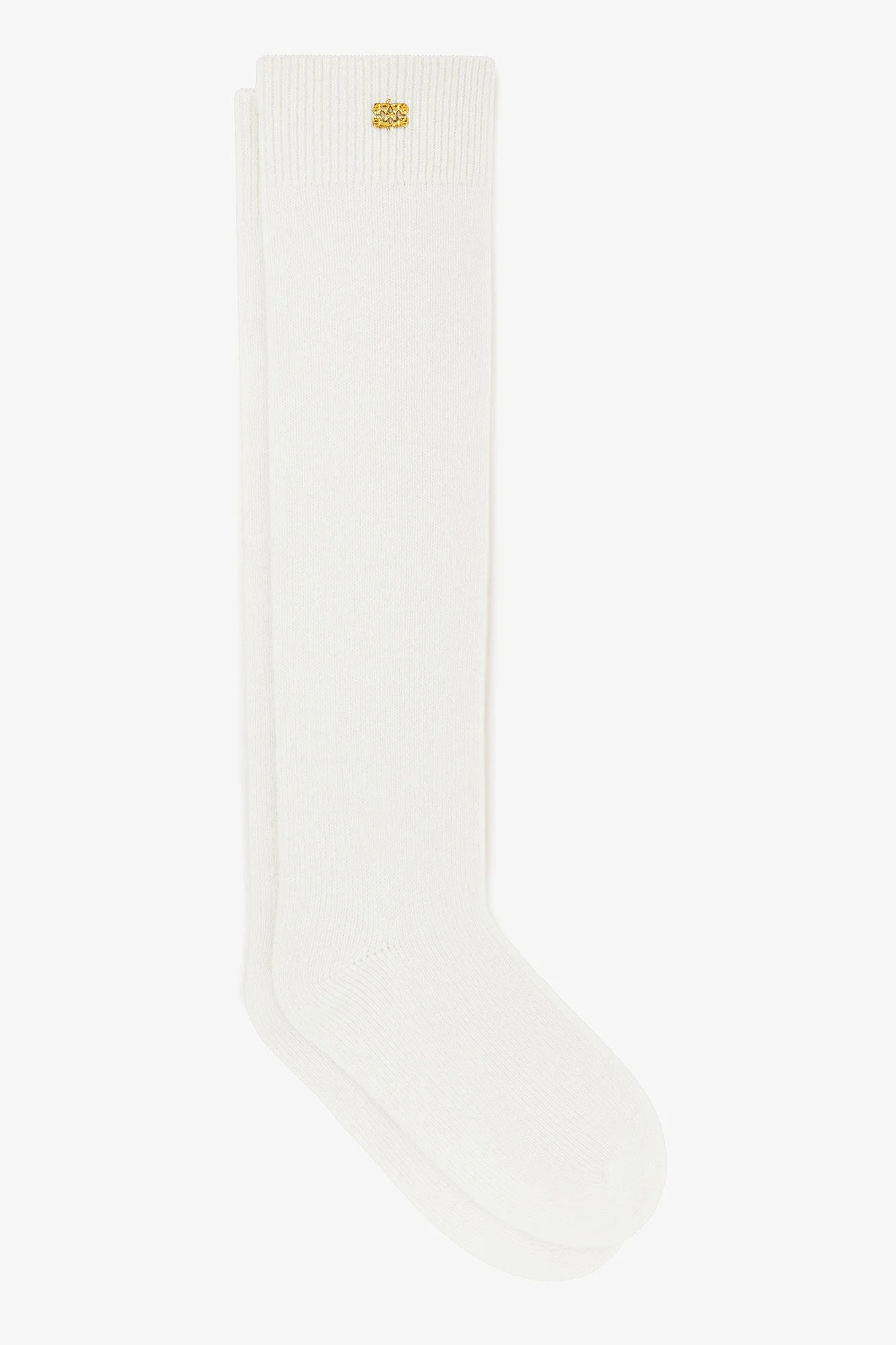 These socks features ribbed edges and a GANNI logo. DETAILS - 46% wool, 41% yak, 12% polyamide, 1% elastane. Learn more about our materials - Ribbed edges - GANNI logo Made in: China Product ID: A7212 SIZE & FIT - For personalised guidance on sizing and fit, contact our Customer Service team - here - .