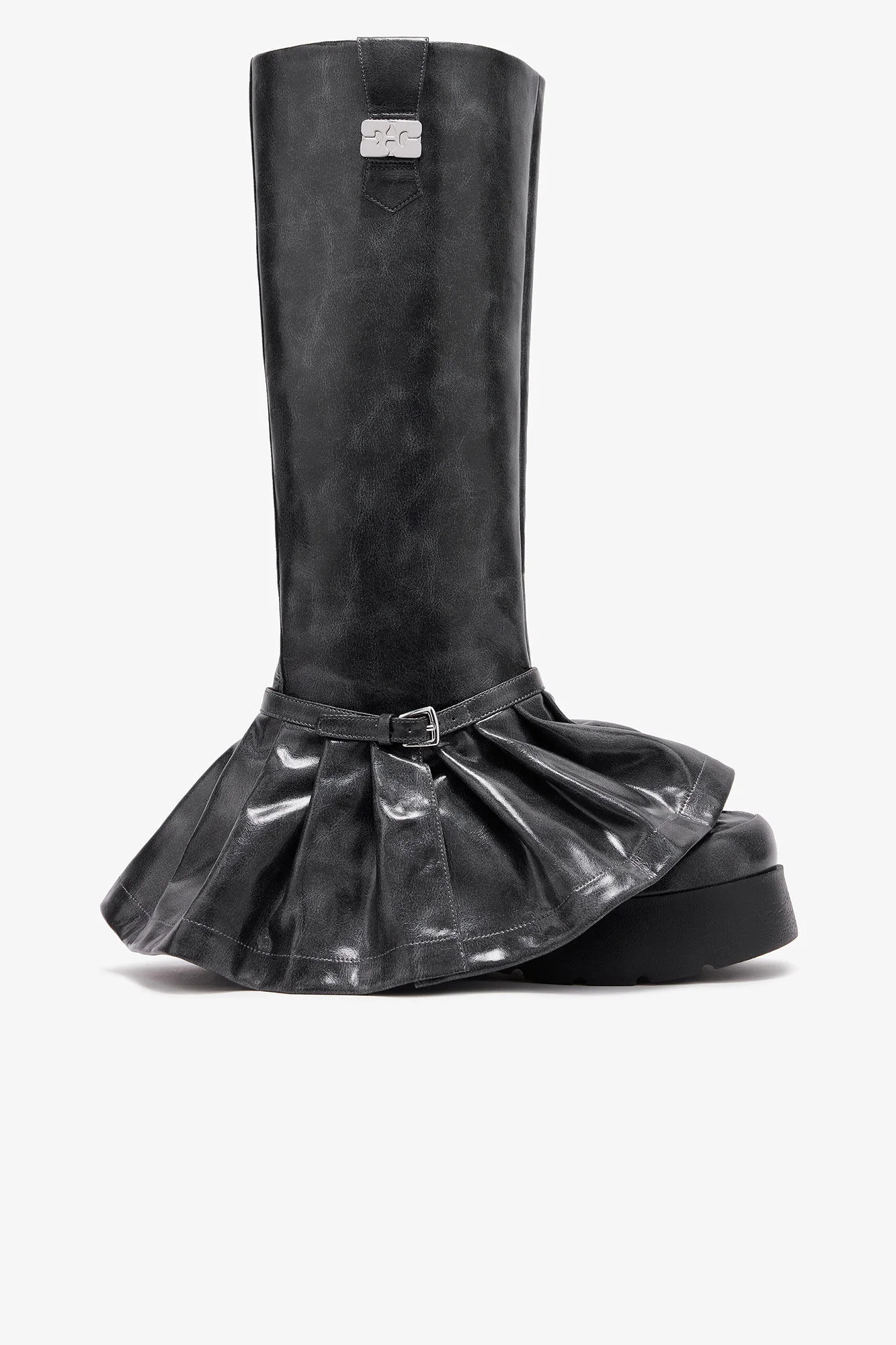 These boots feature a round toe, platform sole, pull tabs and a silver-tone GANNI Butterfly logo. They’re finished with a buckle strap and a removable flared overlay detail. DETAILS - 60% recycled leather, 26% TENCEL™ Lyocell 14% polyurethane fibre Learn more about our materials - Round toe - Platform sole - Pull tabs - Removable flared overlay - Buckle strap detail - Silver-tone GANNI Butterfly logo This style contains PELINOVA®. PELINOVA® is bringing a fresh perspective to leather by reclaiming leather scraps from the fashion and upholstery industries and blending them with TENCEL™ Lyocell, to create a recycled leather material that reduces reliance on virgin resources—without compromising on quality. PELINOVA® is part of GANNI’s Fabrics of the Future, a programme set up in 2019 by GANNI to research, test and eventually scale innovative materials that challenge conventional material methods, paving the way for the future of fashion. Made in: Portugal Product ID: S3246