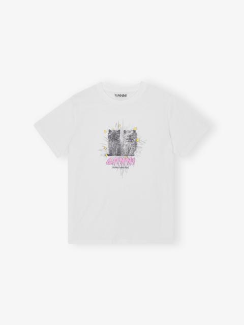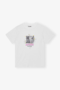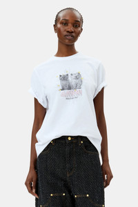 This White Basic Jersey Kittens Relaxed T-shirt features a round neckline, short sleeves and a graphic GANNI print. DETAILS - 100% organic cotton. Learn more about our materials - Crew neck - Short sleeves - GANNI logo Made in: Portugal Product ID: T4060 SIZE & FIT - Relaxed fit - Tonia is 5’9” and wears a size S