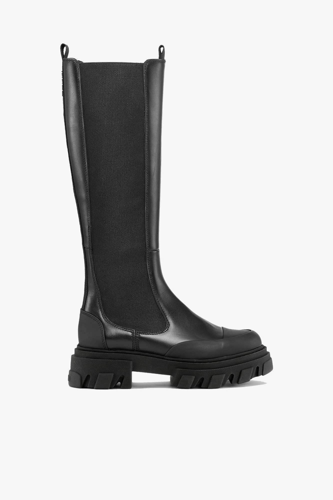These Black Stitch Cleated High Chelsea Boots feature elastic panels, toe cap details, pull tabs, chunky cleated soles and a subtle GANNI logo. DETAILS - 45% recycled leather, 20% recycled poluester, 20% polyurethane, 15% polyester. Learn more about our materials - Lining composition: 76% Polyurethane 24% Viscose - Shaft: 39 - Sole height: 5 Made in: Portugal Product ID: S2575 SIZE & FIT - Fits true to size, take your normal size