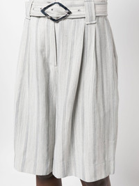 knee-length belted shorts Highlights - Knee-length belted shorts from ganni featuring grey, stripe print, straight leg, belted waist and knee-length. Imported Composition Rayon 47%, Ecovero 21%, Viscose 16%, Polyester 16% SIZE & FIT Model measurements Height 5 ft 10 in(1.77 m) Bust/Chest 29.92 in(76 cm) Hips 34.25 in(87 cm) Waist 23.62 in(60 cm) Measurement FRONT RISE 12.99 in(33 cm) HIPS 40.94 in(104 cm) FittingInformation This piece fits true to size. We recommend you get your regular size Designed to be fitted at the waist, loose over the leg Made with a mid-weight non-stretch fabric Washing instructions Machine Wash