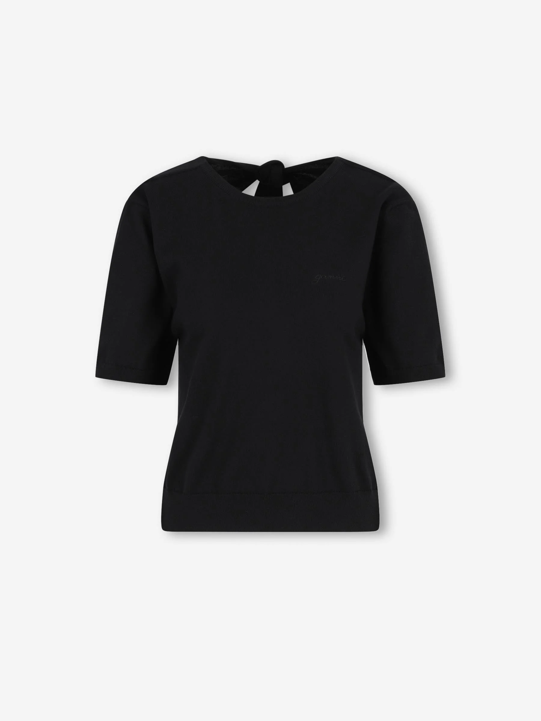SKU: 782-001935 01 BRAND ID: A1070257 T-shirt By Ganni • Regular fit • Made from cotton fabric • Tonal brand graphic motif embroidered on the chest • Ribbed collar, cuffs and hem • Short sleeve • Open back fastened with a tie • Composition: 100% cotton • Made in: Romania