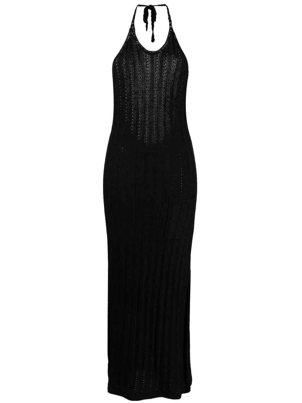 knitted halterneck midi dress Highlights - Knitted halterneck midi dress from ganni featuring black, knitted construction, halterneck tie fastening, high neck, rear tie fastening, low back, two front patch pockets, side slits, mid-length and silver-tone button details. Imported Composition Rayon 65%, Polyamide 35% SIZE & FIT Model measurements Height 5 ft 10 in(1.77 m) Bust/Chest 32.28 in(82 cm) Hips 35.03 in(89 cm) Waist 25.19 in(64 cm) Measurement HIPS 31.49 in(80 cm) LENGTH 51.96 in(132 cm) WAIST 27.55 in(70 cm) FittingInformation This piece fits true to size. We recommend you get your regular size Cut for a slim fit Made with a mid-weight fabric Washing instructions Machine Wash