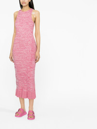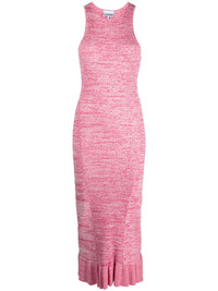 knitted midi dress Ganni presents a sleek knitted dress design and infuses it with its signature playful aesthetic through a vibrant pink hue flowy flared hem. Highlights - Bubblegum pink - Stretch-design - Knitted construction - Round neck - Sleeveless - Mid-length Imported Composition Rayon 56%, Polyamide 30%, Spandex/Elastane 14% SIZE & FIT Model measurements Height 5 ft 10 in(1.77 m) Bust/Chest 32.67 in(83 cm) Hips 35.43 in(90 cm) Waist 23.62 in(60 cm) Measurement HIPS 25.98 in(66 cm) LENGTH 50.78 in(129 cm) WAIST 20.47 in(52 cm)