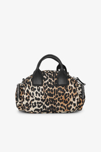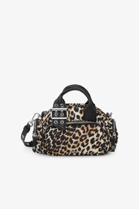 This bag features a top handle and an adjustable shoulder strap with metallic hardware. It has a zip closure, one front pocket, 2 side pockets and a silver-tone GANNI logo. DETAILS - 100% recycled nylon. Learn more about our materials - Lining composition: 100% Recycled Polyester - Leopard print design - Silver-tone GANNI logo - Top handle - Adjustable and removable shoulder strap - Zip closure - 3 pockets - Silver-tone hardware - Buckle and strap detail Made in: China Product ID: A6740 SIZE & FIT - Strap length: 47 cm - Height: 16.5 cm - Width: 19 cm - Depth: 8 cm - For personalised guidance on sizing and fit, contact our Customer Service team - here - .