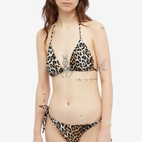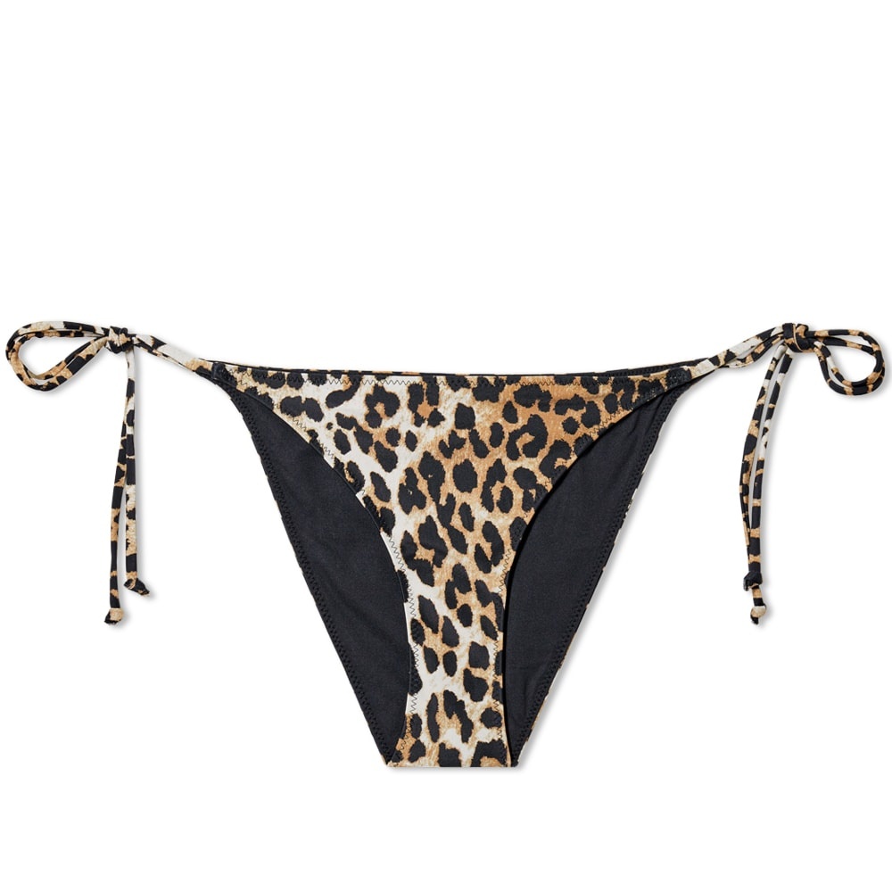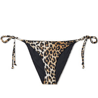 Keep it classic at the poolside with these fierce leopard print bikini bottoms from GANNI. Cut from a recycled nylon with added stretch, their low-rise fit is finished with chic tie strings at the sides and subtle printed branding at the back. Briefs, swimming costumes and bikini bottoms should be tried on over underwear. Please note that for hygiene reasons we are unable to accept returns of swimwear if the strip has been removed. - 78% Recycled Nylon, 22% Elastane - Low-Rise - Tie String Closure - Printed Branding - Made in Portugal