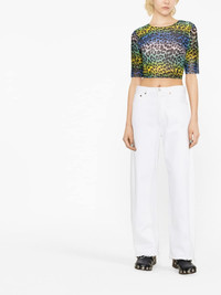 leopard-print crop T-shirt GANNI pairs a leopard motif with an all-over ombre stripe print on this T-shirt. The multicolour hues against the fine mesh fabric, creates a lively finish for the short-sleeve piece. Highlights - Multicolour - All-over leopard print - Stripe pattern - Round neck - Short sleeves - Straight hem Imported Composition Lining: Recycled Polyamide 100% Outer: Recycled Polyamide 91%, Spandex/Elastane 9% SIZE & FIT Model measurements Height 5 ft 10 in(1.79 m) Bust/Chest 31.49 in(80 cm) Hips 35.03 in(89 cm) Waist 23.62 in(60 cm) FittingInformation Designed for a slim fit that sits just away from the body offering a close yet comfortable fit Cropped in length This piece fits true to size – take your usual size Washing instructions Machine Wash