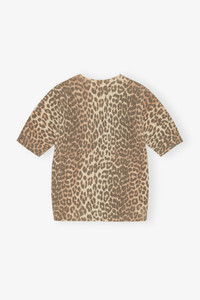 This T-shirt features an all-over leopard print with a GANNI logo and a 'Have a nice day! Please recycle' message on the front. The T-shirt has short sleeves and a ribbed edges. DETAILS - 45% wool, 35% recycled wool, 20% recycled polyamide. Learn more about our materials - Leopard print design - Short sleeves - Ribbed edges - GANNI logo - 'Have a nice day! Please recycle' message Made in: Italy Product ID: K2500 SIZE & FIT - Regular fit - Amber is 5’11” and wears a size S