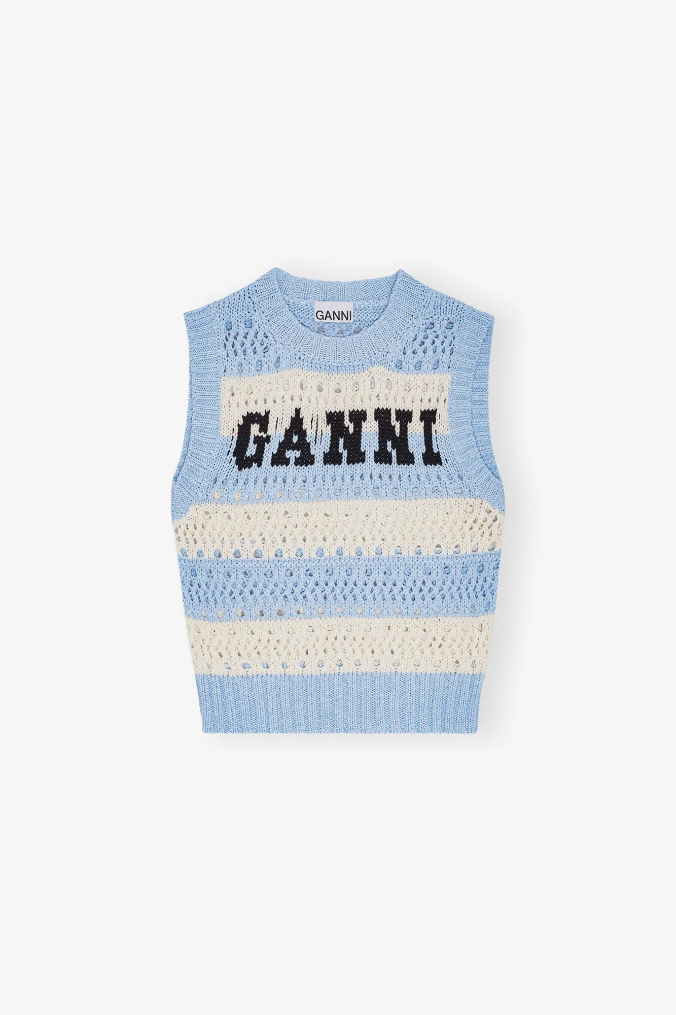 This Light Blue Striped Vest is sleeveless and features the GANNI logo. DETAILS - 50% recycled cotton, 50% recycled polyester. Learn more about our materials - Sleeveless - GANNI logo Made in: Moldova Product ID: K2486 SIZE & FIT - Elvina is 5’11” and wears a size S