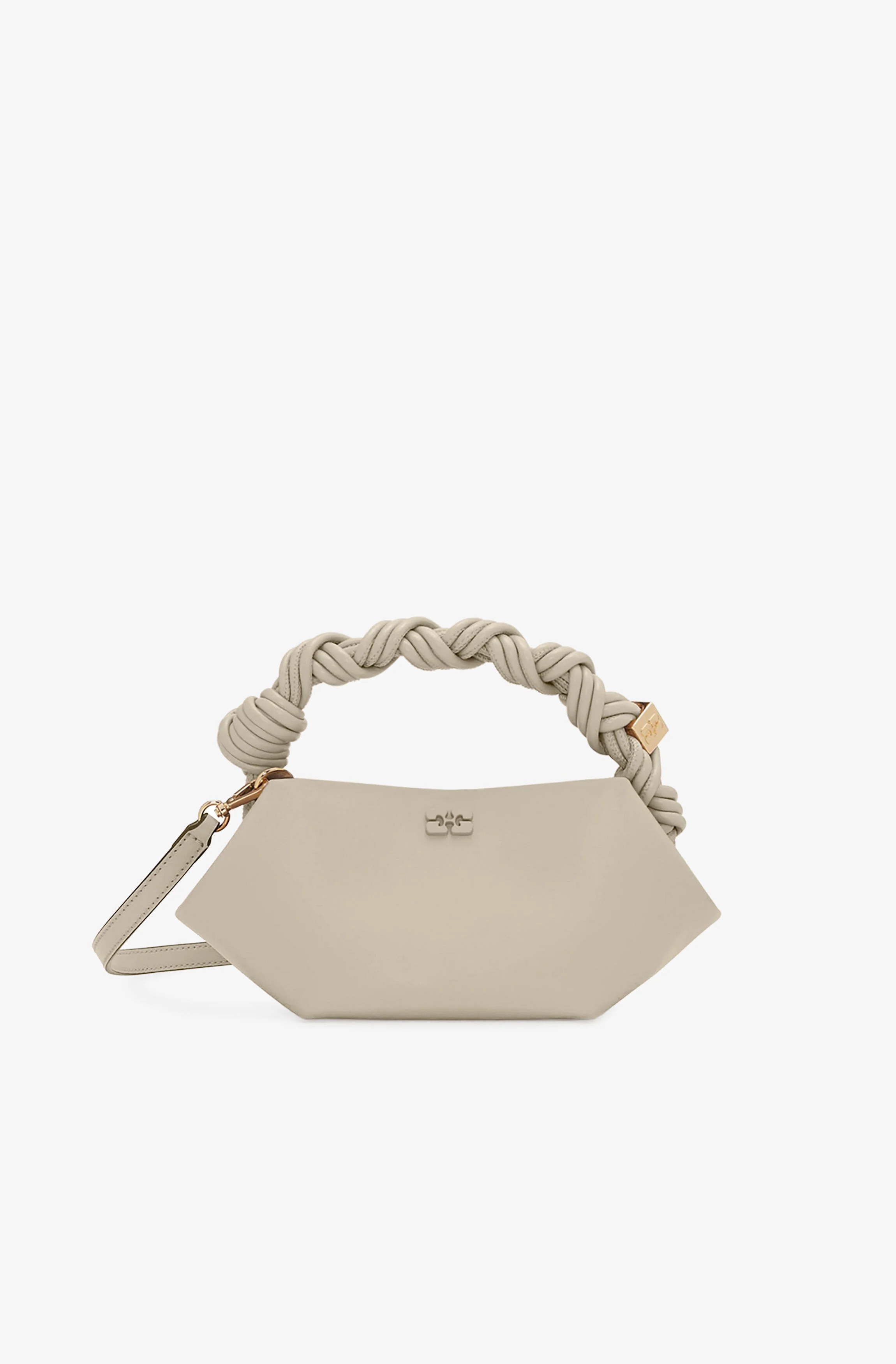 This bag features a tone-on-tone metallic GANNI Butterfly logo, a twisted handle with a braided knot, and a gold-tone metallic dice with a GANNI Butterfly logo engraved. The bag has an internal magnetic closure, a flat card pocket inside, and an adjustable and removable shoulder strap for crossbody wear. DETAILS - 65% recycled leather, 19% polyurethane fibre, 16% polyester. Learn more about our materials - Lining composition: 65% Recycled Cotton 35% Cotton - Adjustable and removable shoulder strap - Tone-on-tone GANNI Butterfly logo - GANNI embossed logo on the back of the bag - Braided top handle with a braided knot - Metallic dice with a GANNI and Butterfly logo engraved - Internal magnet closure - One compartment Made in: China Product ID: A6949 SIZE & FIT - Strap length: 50 cm - Height: 11 cm - Width: 25 cm - Depth: 11.5 cm - For personalised guidance on sizing and fit, contact our Customer Service team - here - .