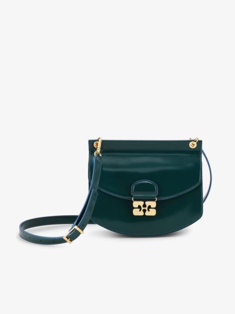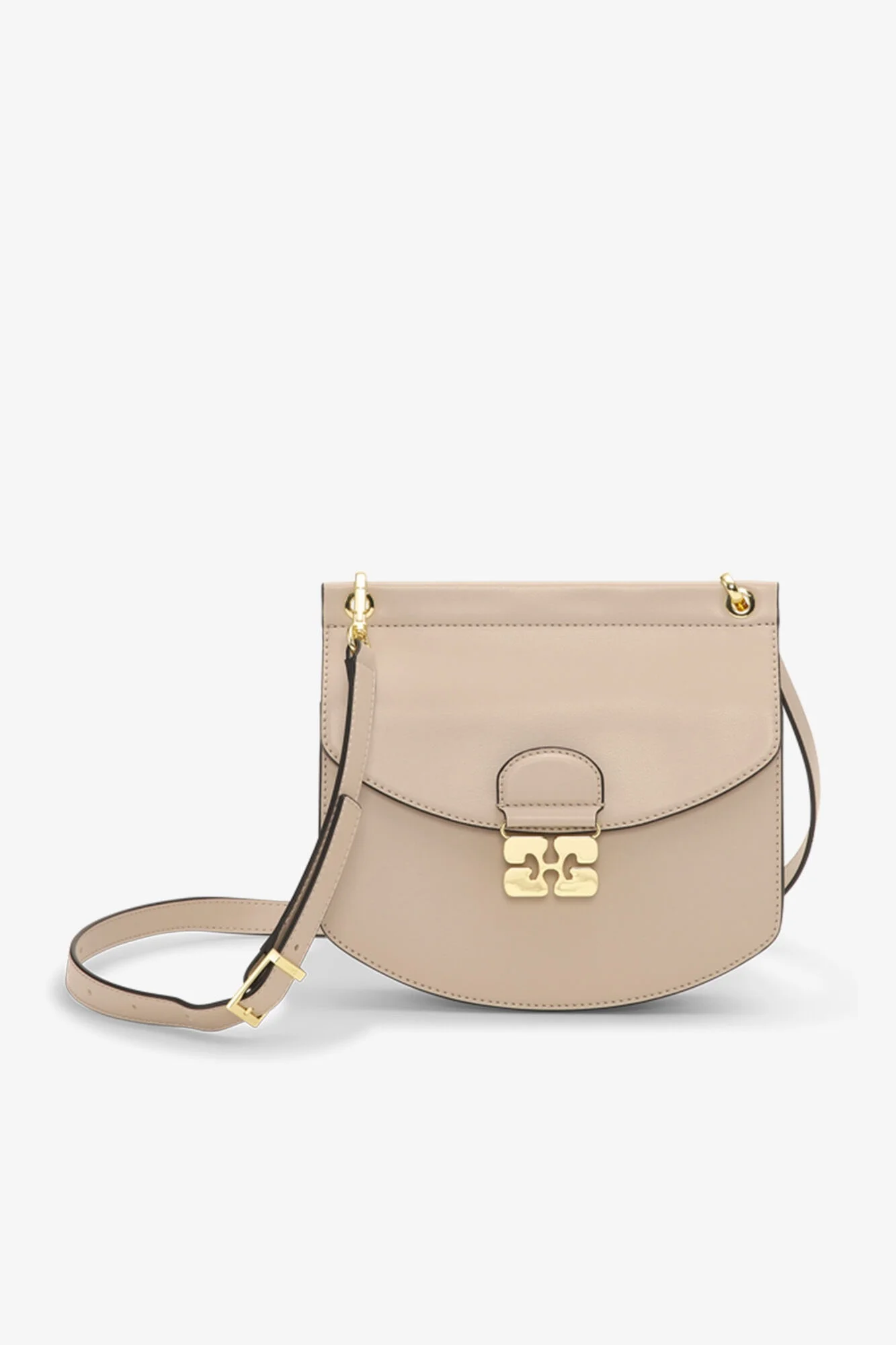 This Small Apo-G Bag comes in a light grey colour with a glossy finish. Crafted from recycled leather, the Apo-G features a magnetic closure with a GANNI Butterfly gold-tone clasp and a detachable strap, allowing for versatile wear as a shoulder bag or clutch. The compact interior has a slip pocket and three main compartments, one of which has a zip closure. DETAILS - 65% recycled leather, 19% polyurethane fibre, 16% polyester. Learn more about our materials - Adjustable and removable shoulder strap - GANNI Butterfly gold-tone clasp - Magnetic closure - Three main compartments, one equipped with a zip closure - Slip pocket Made in: China Product ID: A6460