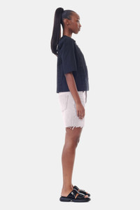 These Light Pink Denim Shorts feature a 5-pocket style with belt loops, zip/button closure, raw edges and a GANNI logo at the back pocket. DETAILS - 100% organic cotton. Learn more about our materials - 5 pocket style with a zip and button closure Made in: Turkey Product ID: J1479 SIZE & FIT - Relaxed fit - Tatiana is 5’9” and wears a size 27