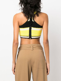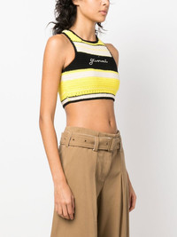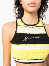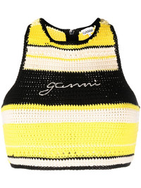 logo-embroidered crochet top Sustainability has been the key to Ganni's huge success. Showing the brand's commitment to making better choices to minimise social and environmental impact, this cropped top is crafted from 100% organic cotton in a black, white and yellow hue. The brand's logo appears on the chest contrasting with the rest of its design. Highlights - Black/white/yellow - Organic cotton - Embroidered logo at the chest - Round neck - Sleeveless - Cropped Imported Composition Organic Cotton 100% SIZE & FIT Model measurements Height 5 ft 9 in(1.76 m) Bust/Chest 31.88 in(81 cm) Hips 35.43 in(90 cm) Waist 24.8 in(63 cm) Measurement LENGTH 12.99 in(33 cm) WAIST 22.83 in(58 cm) FittingInformation This piece fits true to size. We recommend you get your regular size Cut for a slim fit Made with a mid-weight fabric