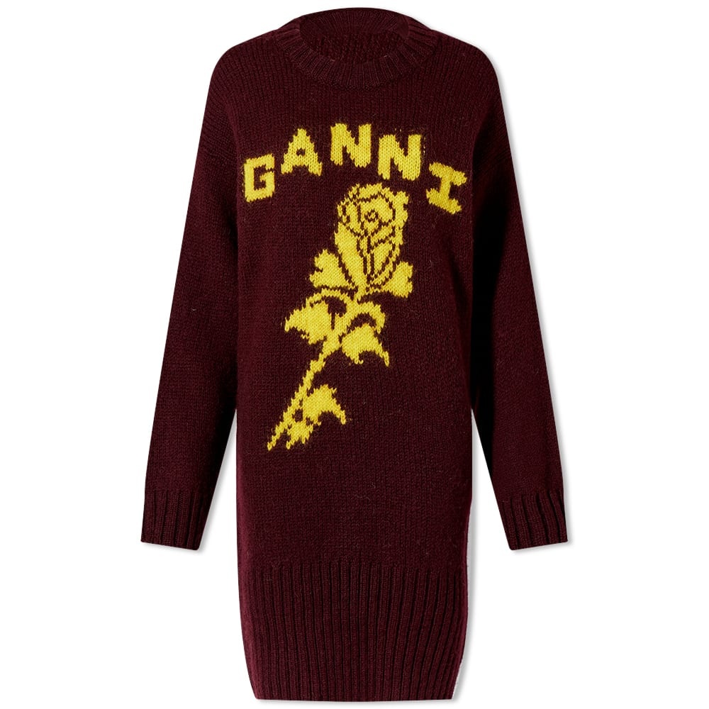 GANNI gets the combination of comfy and chic just right with this knit dress. In a deep red colour, it’s perfect for winter with its thick knit and bright yellow branding. Style with a sleek pair of knee boots for a sophisticated cold weather look. - 100% Organic Wool - Ribbed Crewneck - Engineered Branding - Made in Italy