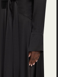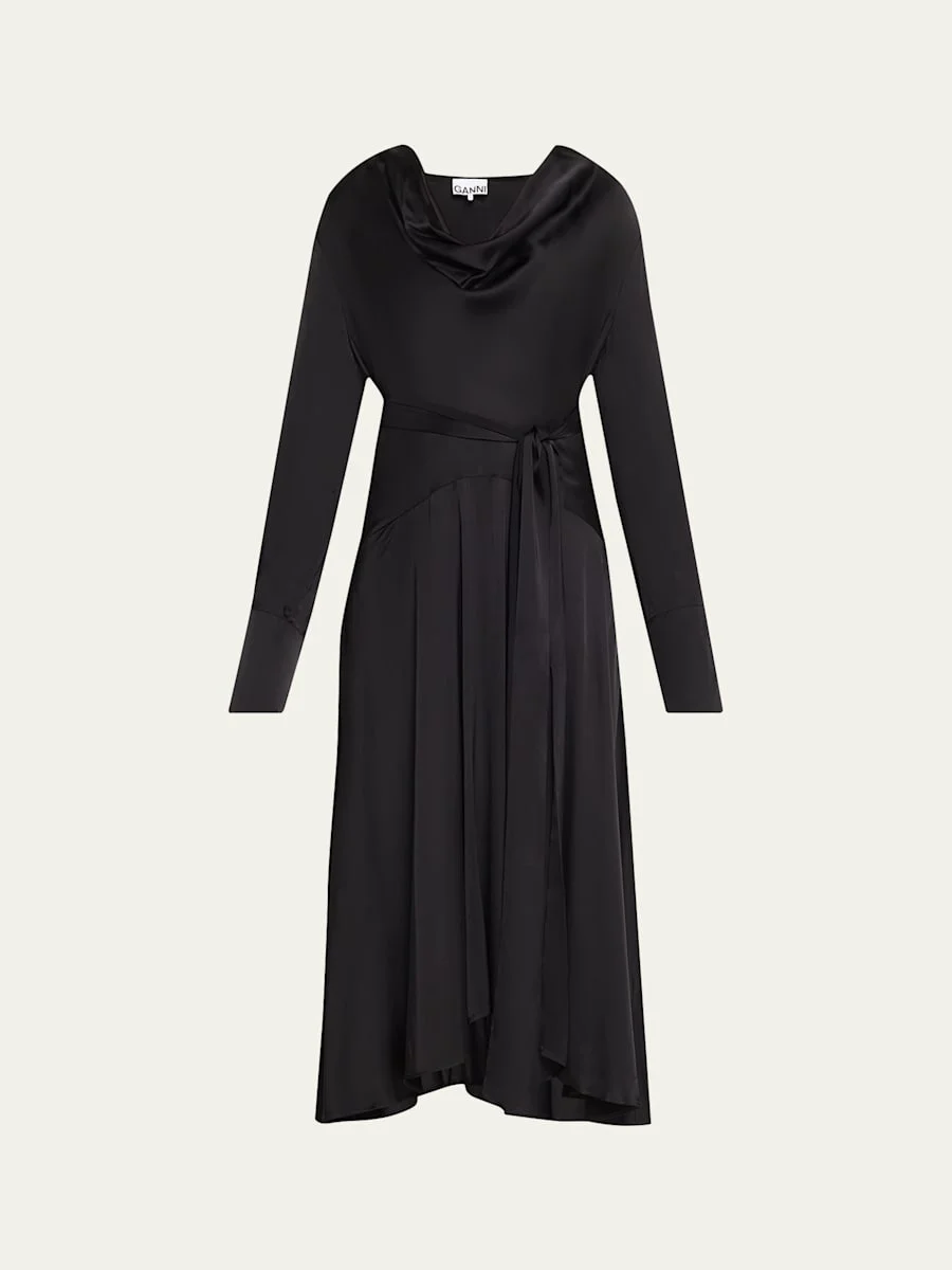 Ganni stretch satin dress adorned with a selftie belt and elegant draping Cowl neckline Long sleeves with button cuffs Relaxed silhouette Hem falls below the knee Slipover style Jutecell® viscose/elastane Imported