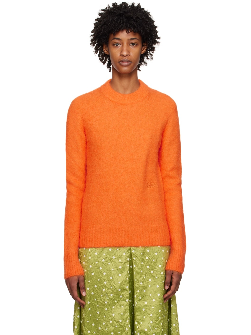 Brushed knit stretch alpaca-blend sweater. · Rib knit crewneck, hem, and cuffs · Logo embroidered at front Supplier color: Vibrant orange
