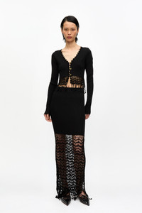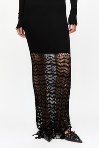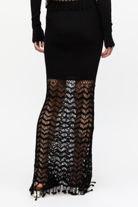 This Black Shiny Crochet Skirt features a ribbed waistband with a crochet lace overlay and a beaded fringe detail. DETAILS - 100% viscose. Learn more about our materials - Fringe detail Made in: China Product ID: K2435 SIZE & FIT - Xia is 5’9” and wears a size S