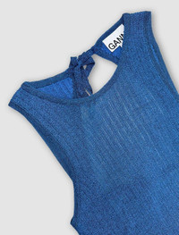 Sparkle rib open-back dress by Ganni has a round neck and open back secured with tying bands and a sparkly pattern. It follows a sheer slip-on styling. Product Reference Code: K1934 891