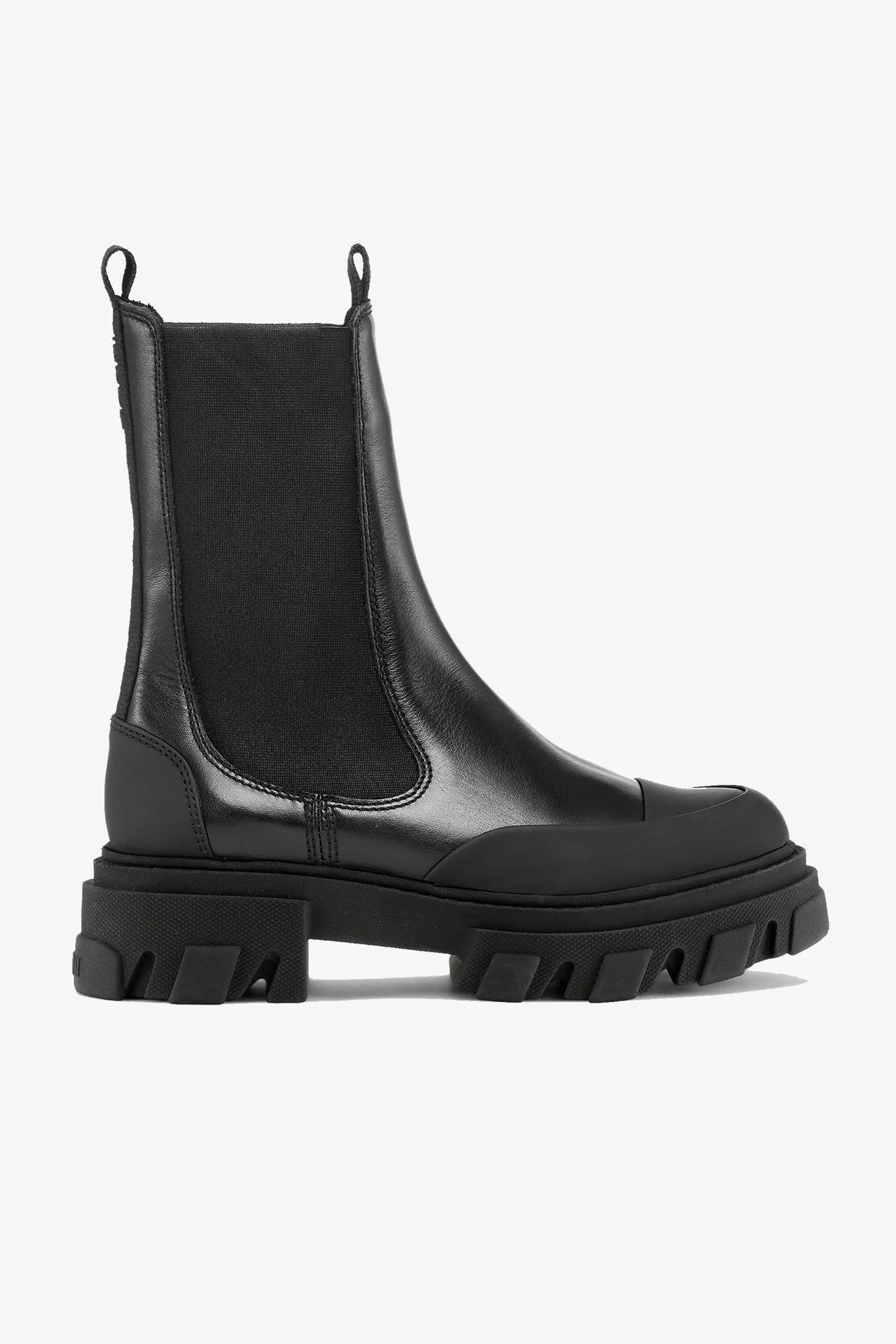 These Black Stitch Cleated Mid Chelsea Boots feature elastic panels, toe cap details, pull tabs, chunky cleated soles and a subtle GANNI logo. DETAILS - 45% recycled leather, 20% recycled poluester, 20% polyurethane, 15% polyester. Learn more about our materials - Lining composition: 76% Polyurethane 24% Viscose - Shaft: 19 - Sole height: 5 - Mid-calf boots - Rounded toe - Elastic panels - Pull tabs Made in: Portugal Product ID: S2576 SIZE & FIT - Consider taking a larger size for a more comfortable fit
