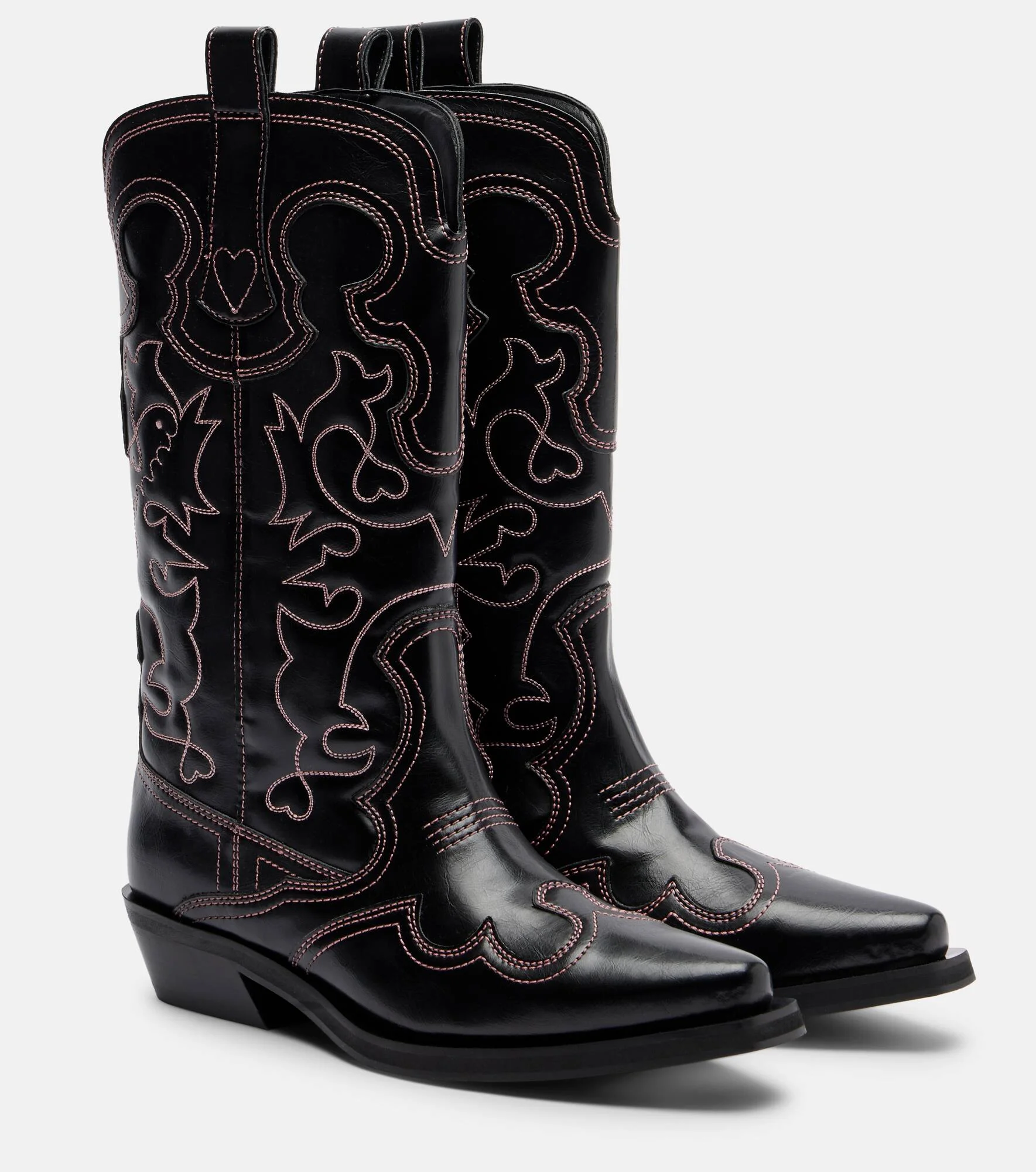 The Mid Shaft cowboy boots from Ganni bring a Western look to your favorite outfits. This pair flaunts a classic pointed toe with flared heels, and the embroidered detailing adds a refined touch. Product Details - Upper: polyurethane, fabric - Lining: synthetic material - Sole: synthetic material insole, rubber sole - Color: black - Toe shape: pointed toe - Made in Portugal - Includes: dust bag, shoe box - Designer color name: Black/Pink - Item number: P01146960 Size & Fit - Fits slightly large to size - we recommend trying a half size smaller - European sizes - 4cm-1.5" heel - 30cm-12" shaft height (size EU 38) - 35cm-14" shaft width (size EU 38) - shaft width measured on largest part of boot