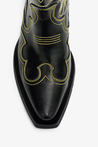 These boots feature a pointed toe, embroidered detailing and a low, angled heel. DETAILS - 64% Polyurethane, 23% Recycled Polyester, 13% Cotton Learn more about our materials - Mid-calf boots - Pointed toe - Low, angled heel - Yellow stitching The piece contains Oleatex™, a next-gen material that is part of our Fabrics of the Future initiative. Oleatex™ is an innovative alternative to synthetic materials, crafted using byproducts of olive oil production to form a bio-based polyurethane (PU) top coating bonded to a cotton, viscose or recycled polyester backing. Fabrics of the Future is a programme set up in 2019 by GANNI to research, test and eventually scale innovative materials that challenge conventional material methods, paving the way for the future of fashion. Made in: Portugal Product ID: B1010046