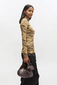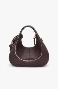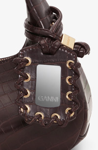This bag features a top handle, adjustable and removable strap and a zipper closing. The bag has a mirror hangtag and an internal pocket. DETAILS - 51% recycled leather, 23% TENCEL™ Lyocell, 26% polyurethane. Learn more about our materials - Lining composition: 85% Recycled Polyester 15% Polyester - Top handle - Adjustable and removable shoulder strap - GANNI Butterfly logo - GANNI embossed logo on the back of the bag - Zipper closing - Metallic dice with a GANNI and Butterfly logo engraved - Mirror hangtag - One compartment - Internal patch pocket This style contains PELINOVA®. PELINOVA® is bringing a fresh perspective to leather by reclaiming leather scraps from the fashion and upholstery industries and blending them with TENCEL™ Lyocell, to create a recycled leather material that reduces reliance on virgin resources—without compromising on quality. PELINOVA® is part of GANNI’s Fabrics of the Future, a programme set up in 2019 by GANNI to research, test and eventually scale innovative materials that challenge conventional material methods, paving the way for the future of fashion. Made in: China Product ID: A7291 SIZE & FIT - Shoulder strap: 60 cm - Height: 24.5 cm - Width: 24 cm - Depth: 12 cm - For personalised guidance on sizing and fit, contact our Customer Service team - here - .