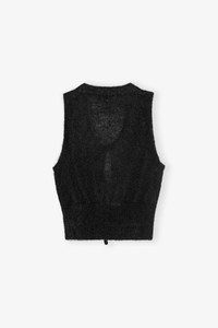 This Black Tie String Vest features an open round neckline with tie bands, ribbed edges and an embroidered GANNI logo. DETAILS - 55% mohair, 29% recycled nylon, 16% merino. Learn more about our materials - Open round neckline with tie bands - Ribbed edges - Embroidered GANNI logo Made in: China Product ID: K2514 SIZE & FIT - Tonia is 5’9” and wears a size S