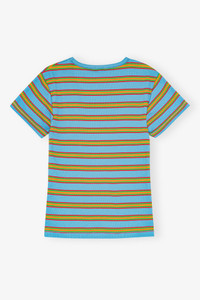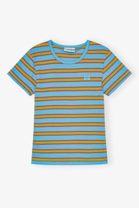 This t-shirt features a ribbed texture with multicolored stripes. DETAILS - 95% organic cotton, 5% elastane. Learn more about our materials - Ribbed texture - Multicolored stripes - Round neckline - Short sleeves - Embroidered GANNI logo on chest Made in: Portugal Product ID: T4398 SIZE & FIT - Slim fit - For personalised guidance on sizing and fit, contact our Customer Service team - here - .