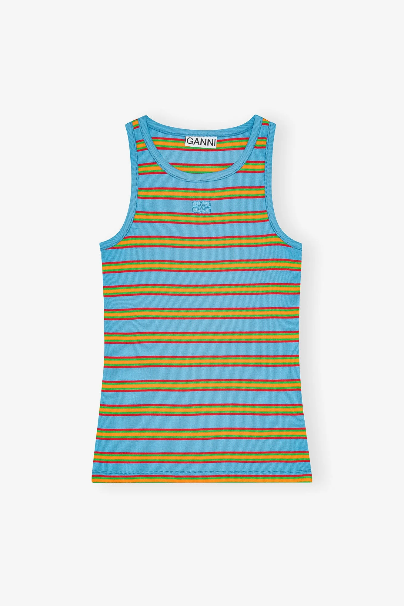 This tank top features a ribbed texture with multicolored stripes. DETAILS - 95% organic cotton, 5% elastane. Learn more about our materials - Ribbed texture - Multicoloured stripes - Round neckline - Sleeveless design - Embroidered GANNI logo on chest Made in: Portugal Product ID: T4400 SIZE & FIT - Form fitted - For personalised guidance on sizing and fit, contact our Customer Service team - here - .