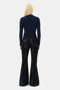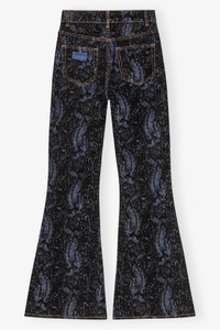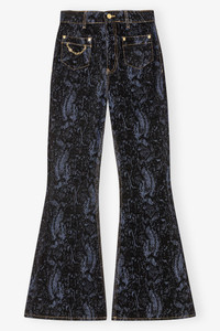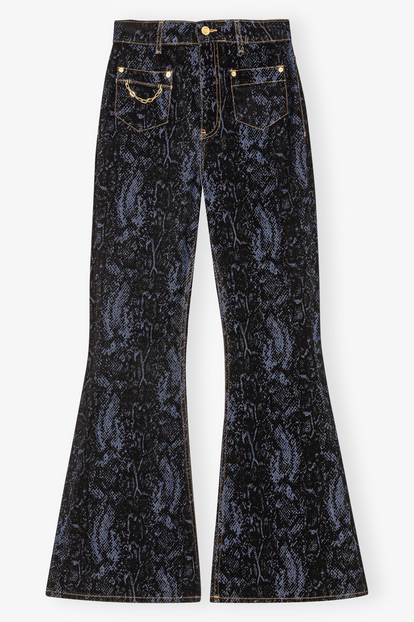 These jeans feature 4 pockets and zip and button closure. The jeans are featuring a detachable gold-tone chain. DETAILS - 99% organic cotton, 1% elastane. Learn more about our materials - Lining composition: 100% recycled polyester - 4 pockets - Belt loops - Button & zipper closure - GANNI logo patch - Detachable chain detail Made in: Tunisia Product ID: J1612 SIZE & FIT - Slim fit - High-waisted - Flared cut - Lisandra is 5’10” and wears a size 27