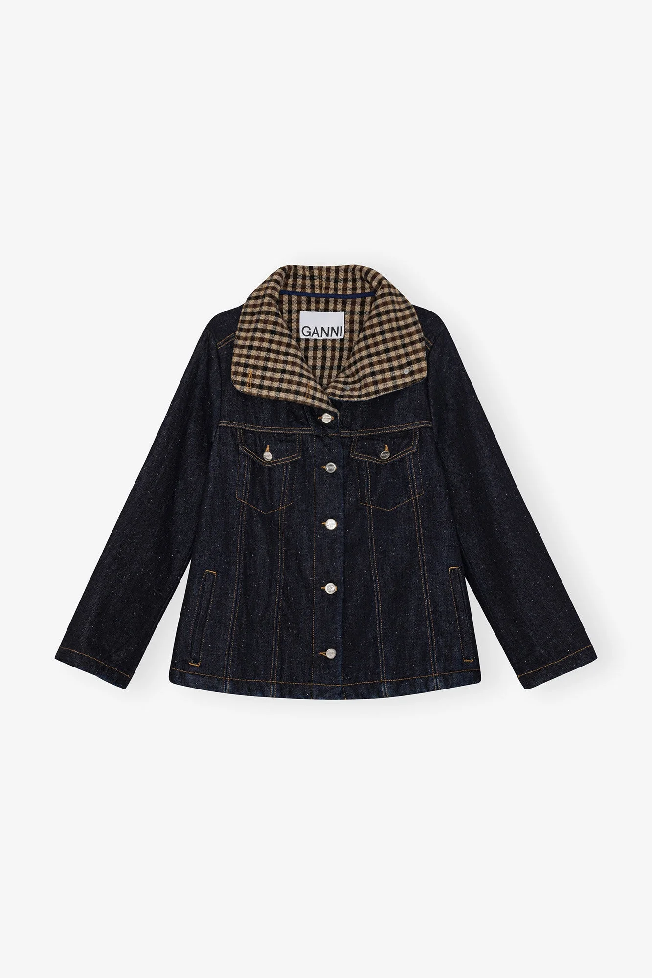 This jacket features a check print collar, button-front closure, 4 pockets and a GANNI logo patch on the back. DETAILS - 100% organic cotton. Learn more about our materials - Check print collar - Button-front closure - 4 pockets - GANNI logo patch - Contrast stitching Made in: Italy Product ID: J1766 SIZE & FIT - Relaxed fit - Chen is 5’10” and wears a size US 4 - For personalised guidance on sizing and fit, contact our Customer Service team - here - .