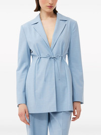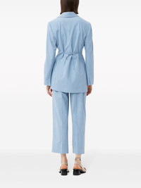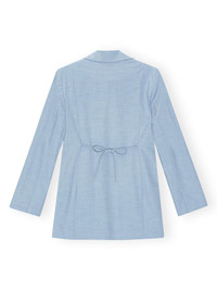 notched-lapels string-tie blazer This GANNI blazer is cut from blue worsted tailoring fabric with smart notch lapels and slender self-ties at the front and back of the waist to secure and adjust the silhouette. The satin lining ensures smooth layering. Highlights - Powder blue - Recycled polyester blend/ecovero™ viscose blend - Stretch-design - Notched lapels - Bow detailing - Tie strings - Long sleeves - Straight hem Imported Composition EcoVero Viscose (LENZING) 48%, Recycled Polyester 44%, Elastane 5%, Polyester 3% Washing instructions Read Manufacturer Guidelines