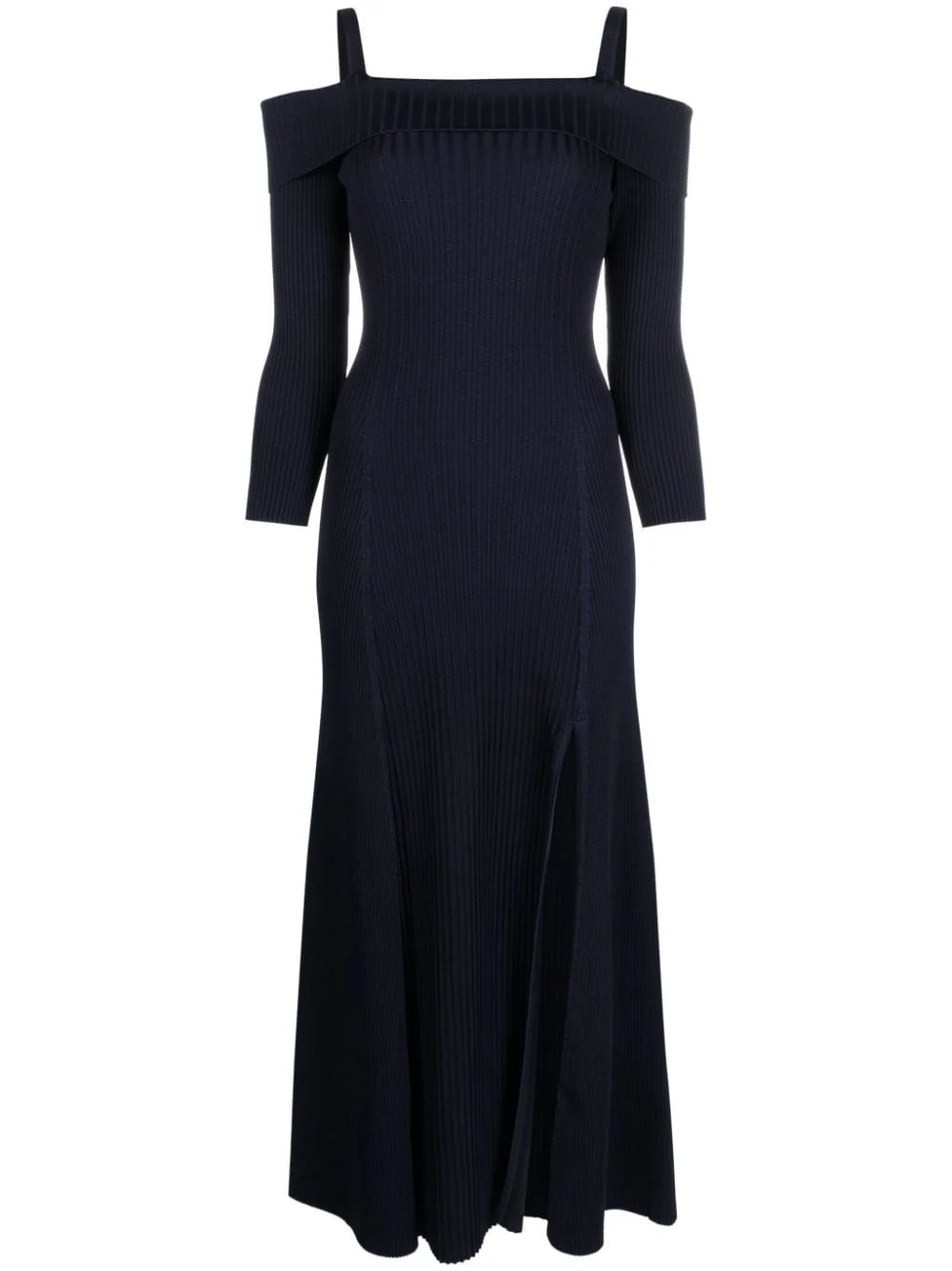 off-shoulder midi dress Based in Copenhagen, GANNI is the fashion brand bringing the cool factor to everyday dressing. A prime example, this dress features a folded off-shoulder neckline with slim straps and a thigh-hight side split at the hem. Highlights - Navy blue - Ribbed knit - Wide shoulder straps - Off-shoulder - Mid-length Imported Composition Rayon 56%, Polyamide 43%, Spandex/Elastane 1% SIZE & FIT Model measurements Height 5 ft 10 in(1.78 m) Bust/Chest 30.7 in(78 cm) Hips 34.64 in(88 cm) Waist 23.22 in(59 cm) FittingInformation Designed for a slim fit that sits just away from the body offering a close yet comfortable fit Made from a midweight stretch fabric, this piece offers elasticity and flexibility when worn This piece fits true to size – take your usual size Washing instructions Machine Wash