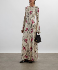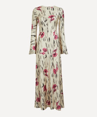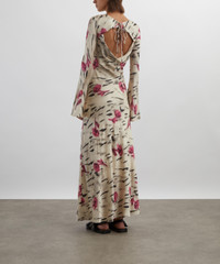 DETAILS Satin maxi dress Slim fit Long fluted sleeves Round neckline Open back with tie string closure Lined SIZE & FIT Model is 176cm/5'8"; Chest: 76.5cm; Waist: 61.5cm; Hip: 88cm and wears a size 8 COMPOSITION & CARE 96% Viscose; 4% Elastane Lining: 97% Polyester; 3% Elastane Machine wash, cold