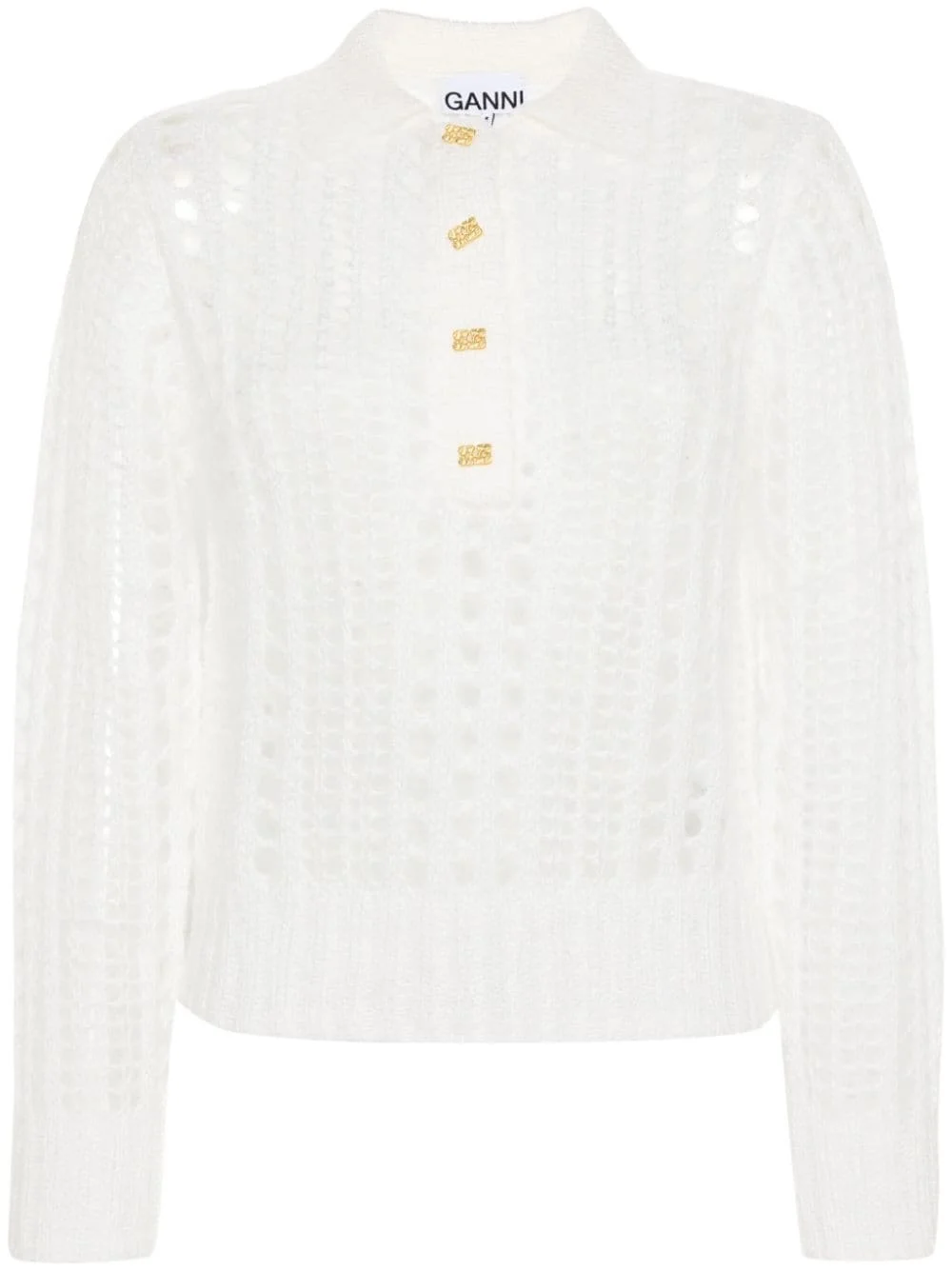open-knit polo-collar jumper Highlights - White - Mohair blend - Knitted construction - Open knit - Gold-tone logo-shaped buttons - Polo collar - Front button placket - Long sleeves - Ribbed cuffs and hem Imported Composition Mohair 55%, Polyamide 29%, Wool 16% SIZE & FIT Model measurements Height 5 ft 11 in(1.8 m) Bust/Chest 31.49 in(80 cm) Hips 36.22 in(92 cm) Waist 25.59 in(65 cm) FittingInformation Designed for a slim fit that sits just away from the body offering a close yet comfortable fit Made with a midweight knit, this piece offers some stretch This piece fits true to size – take your usual size Washing instructions Hand Wash