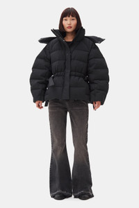 This Black Tech Oversized Puffer Jacket features a high collar, a detachable hood and a front zipper closure with a hidden placket. The jacket has adjustable ties at the waist and side pockets. DETAILS - 100% recycled polyester. Learn more about our materials - Lining composition: 100% Cotton - High collar - Front zipper closure with a hidden placket - Side pockets - Adjustable ties at the waist - Hood Made in: China Product ID: F9496 SIZE & FIT - Oversized fit - Ariunzul is 5’9” and wears a size S/M