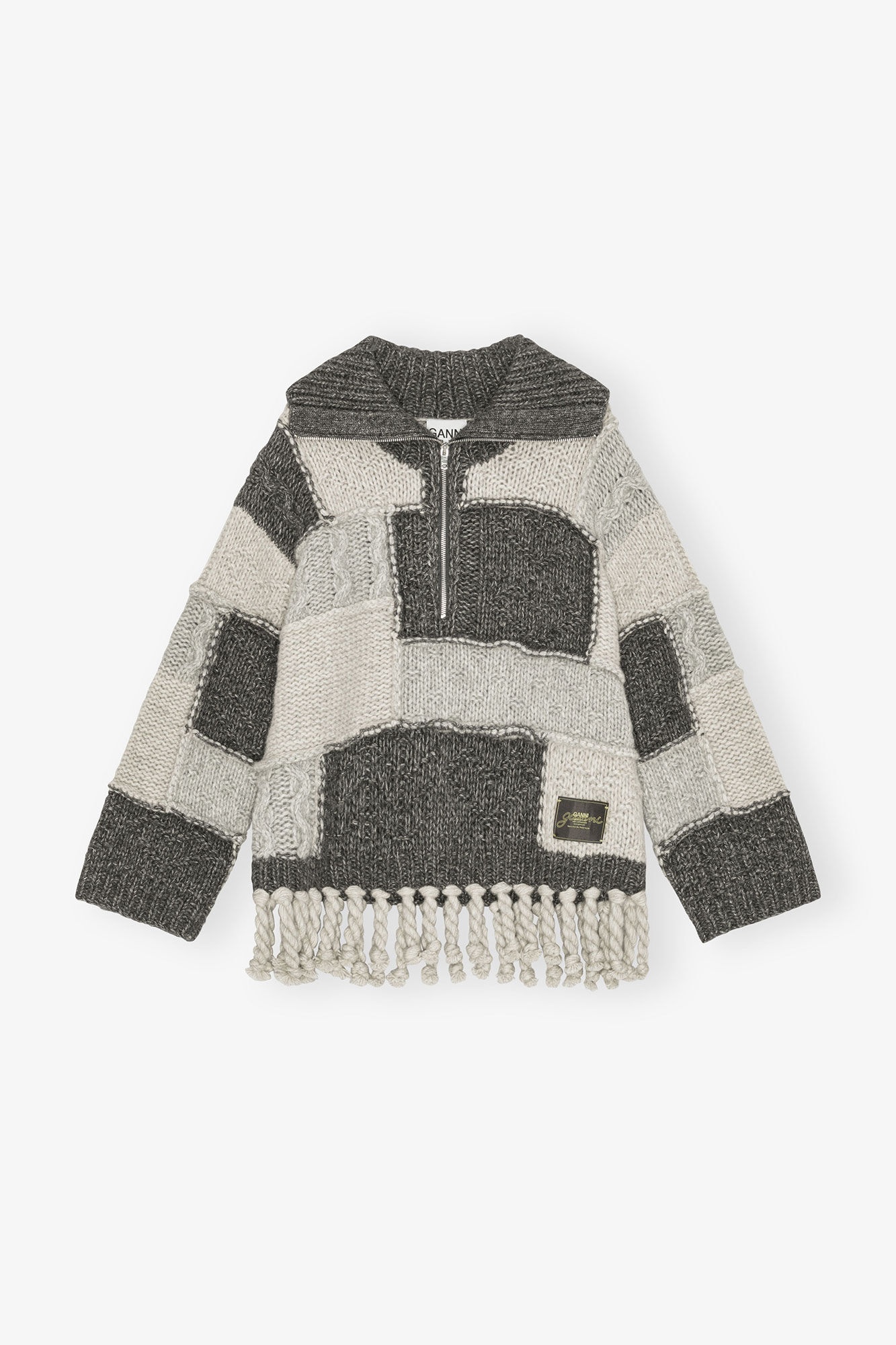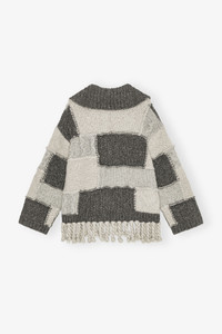 This sweater features a patchwork design with a zip closure at the front. The sweater has a fringe hem and a GANNI logo patch at the front. DETAILS - 55% wool, 45% organic cotton. Learn more about our materials - Patchwork design - Knit collar - Zip closure - GANNI logo patch - Fringe hem detail Made in: China Product ID: K2508 SIZE & FIT - Oversized fit - Bernie is 5’10” and wears a size S/M - For personalised guidance on sizing and fit, contact our Customer Service team - here - .
